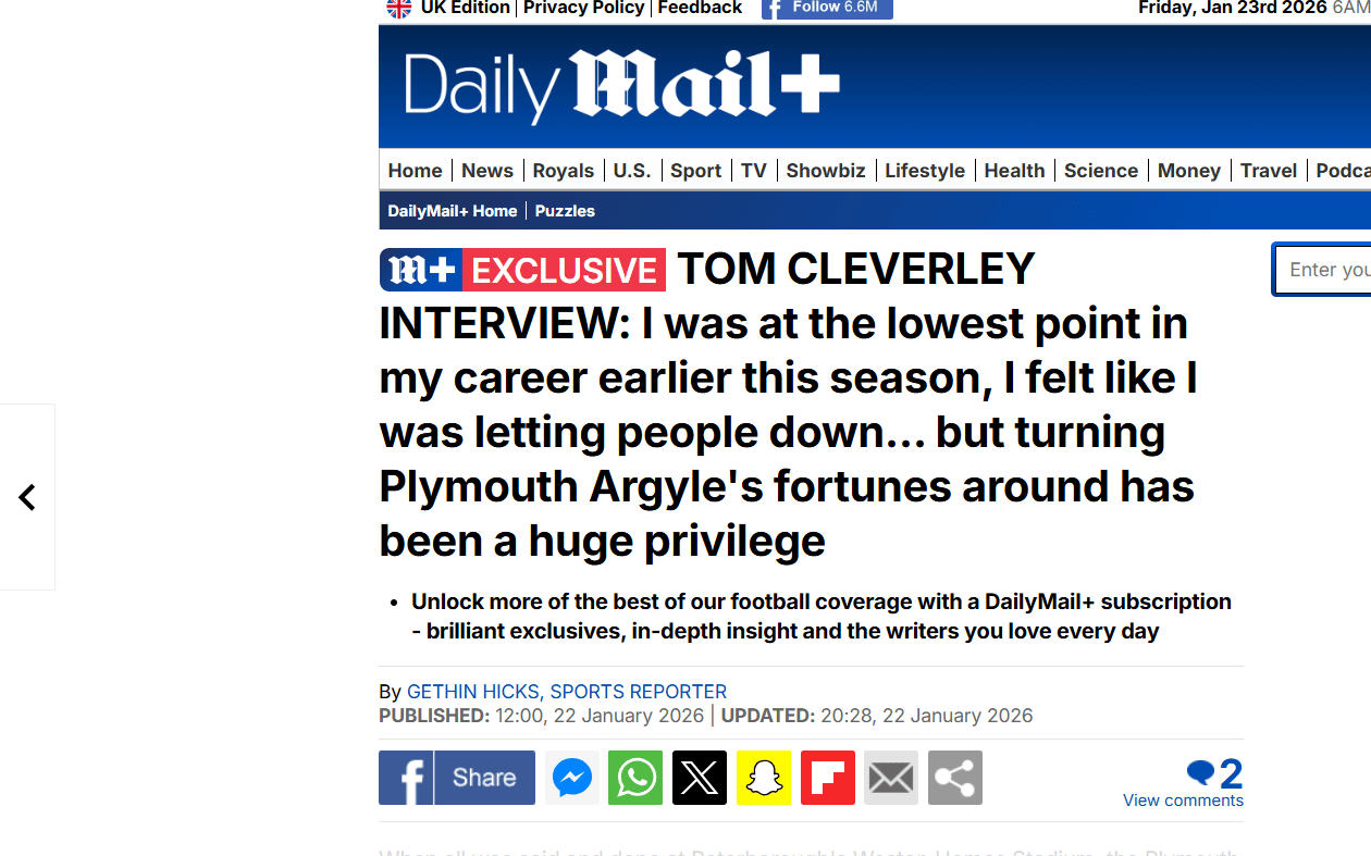 Tom Cleverley’s interview with The Daily Mail is an interesting one especially when it has the headline: I was at the lowest point in my career earlier this season, I felt like I was letting people down... but turning Plymouth Argyle's fortunes around has been a huge privilege